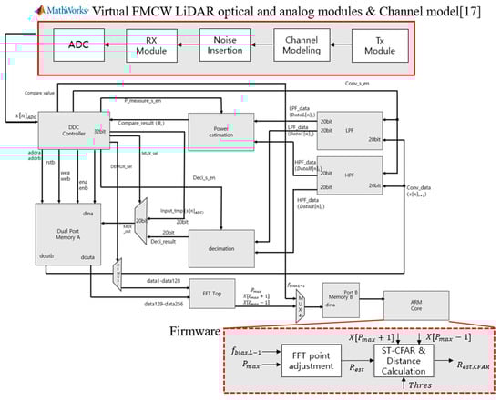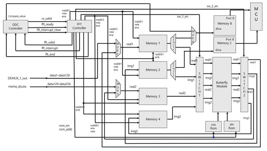 17], channel model, noise insertion, and ADC module are designed by MATLAB Simulink. The simulation model can generate time-domain digital samples of ADC depending on the target distance, and the generated data with 8192 samples send from a PC to an ARM core on an FPGA board through wire connection. The data is observed as incoming from the ARM core to the AXI4-Lite protocol, which is stored in Memory A via the MUX. After that, the stored data are sequentially entered into the inputs of the LPF (Low Pass Filter) block, and the HPF block, respectively, and the filtered results are simultaneously entered into the power estimation block, and the Decimation block, respectively. The power estimation block sends the power comparison result to the Controller, and the Decimation block sends the LPF block result and the HPF block result to the MUX in sequence. At this time, after multiplying the HPF block result by cos data, it will be sent to MUX. The DDC controller will pass the decimated LPF result or decimated HPF result stored in Memory A to the LPF block and HPF block, based on the result output from the Power estimation block. In the same process, if 5 times are satisfied, the DDC Controller transfers the Selection signal of DEMUX 1 and sends the final 256 samples to the FFT TOP. Finally, the information to calculate the target distance,