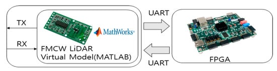20]. Using MATLAB, a virtual optical module is implemented, the Beat Frequency is generated after transmission and reception, and the generated Beat Frequency data is transmitted to the FPGA via the UART standard. After that, after performing DDC and FFT processing inside the FPGA, n samples are sent to the PC via UART via the final