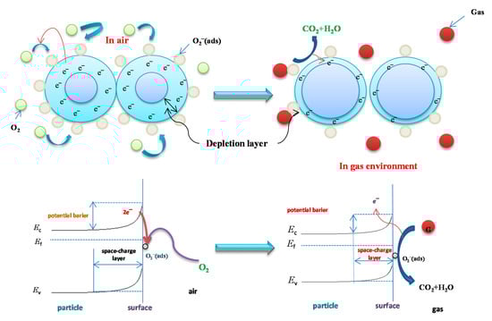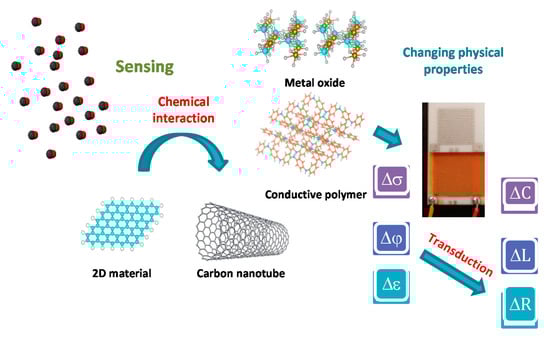 High sensitivity, fast response/recovery, and good selectivity are generally required of a good sensing material. Development of low cost and reliable sensing devices for the detection of gases, especially at room temperature remains a significant scientific and technological challenge. [11]. Gas sensors based on different sensing materials and methods can be classified according to the detection method. Variation in electric properties is one class of methods [12,13], while other sensing methods include optic, acoustic, chromatographic, and calorimetric gas sensors. When the surface of a semiconductor (metal oxide, carbon nanotube, conducting polymer, 2D material) gas sensor is exposed to the environment, gas interacts with the sensing material and changes its main physical parameters such as conductivity, permittivity, and work function, as shown in Figure 2.