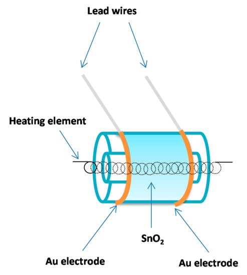 Interaction with a reducing gas gives rise to an increase in conductivity, while an oxidizing gas serves to deplete the sensing layer of charge carrying electrons, resulting in a decrease in conductivity [67]. Surface states in SnO2 behave as electron donors or acceptors. Electron donors or acceptors at the surface cause an exchange of electrons within the interior of the semiconductor forming a space charge layer close to the surface. Gas interacts better with a porous surface, so this is a prerequisite of a good sensing material [68,69]. The specific surface of a gas sensing material needs to be high to achieve increased reaction with the target gas depending on the material grain size. Due to its high sensitivity to different gases, tin-oxide-based sensors can detect low levels of gas concentration, though tin-oxides suffer from low selectivity.