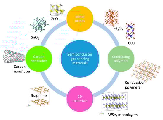 Since the 1980s, research into different gas sensing materials has been quite intense and widespread. It has diversified from metal oxides that are still the subject of much research especially nanostructures [11,14], to conducting polymers [18,27], since 2000 to carbon nanotubes [28,29] and continued with their composites [30,31,32], and more recently 2D materials [15,33], as shown in Figure 4. The crystalline structures were drawn using VESTA [34]. These novel materials are still in the research phase rather than applied widely in commercial applications. In addition to promising properties, they have many shortcomings that need to be dealt with first. Application of conducting polymers is hampered by the fact that fabrication is complicated and time consuming [18]. Due to oxidation, the lifetime of gas sensing devices based on conducting polymers is relatively short (9–18 months) compared to metal oxide gas sensors. In the case of 2D materials fabrication costs are also high and other problems are detection limits, poor selectivity, and slow recovery of the gas sensor baseline [35].