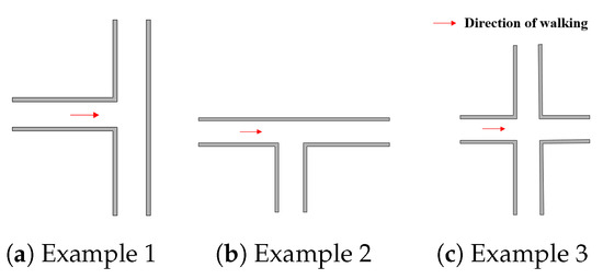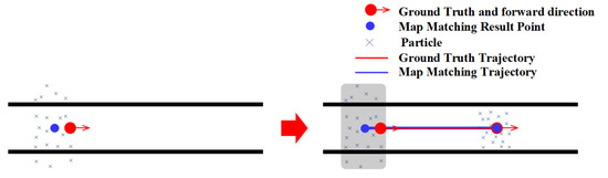 Narrow corridor refers to a narrow aisle surrounded by walls, which can provide heading constraints and boundary constraints. Narrow corridors help the PF improve the location estimation accuracy by limiting particles to forward along the walking direction and eliminating these particles that cross walls. As shown in Figure 11, the particles are usually restricted to move along the walking direction in a narrow corridor, and these particles that move to the wrong direction will soon hit/cross the walls on both sides of the corridor, which will be eliminated in the state estimation stage. Only particles with the movement direction similar to the user’s walking direction are left and used to calculate the user’s location. This will make the PF result in a better accuracy.