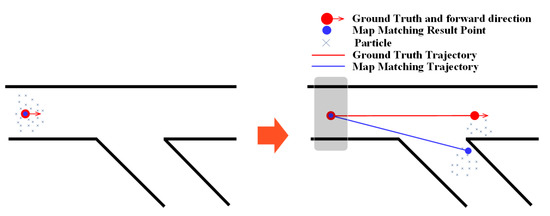 Particle filtering is one of commonly-used map matching methods, which uses a set of particles to approximate the posterior distribution of some stochastic process given noisy observations. These particles are associated with a set of weights. In each round, particles propagate according to the state model, and the corresponding weights would be updated based on observations and spatial constraints. For instance, if a particle crosses a wall or lies in non-navigable areas, the weight of this particle would be set to 0. The final step is to re-sample these particles according to their weights and those whose weights are below a threshold are removed. Over time, the particles typically converge to the most likely position of the user. Map matching based on particle filtering can usually achieve relatively high positioning accuracy, but it suffers from heavy computational cost [22].