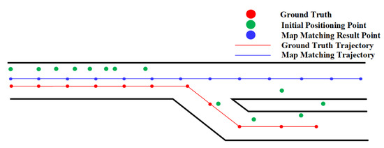 The mismatching of HMM, which is caused by forks, also occurs on routes 3 and 4, as shown in Figure 18 and Figure 19. For route 3, we can see that the trajectory was mistakenly matched to the middle path, leading to a large positioning error in the area. However, this error can be corrected by increasing the length and range of trajectories, as shown in Figure 19 on route 4. Due to the range of trajectories is increased, mismatching would lead to very low emission probability. Therefore, the HMM will re-match the entire trajectory and correct it to the right path. Therefore, the overall positioning accuracy on route 4 is higher than that on route 3.