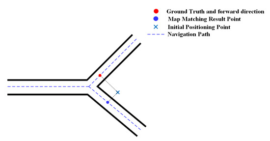 The effect of fork on the geometric algorithm is illustrated in Figure 7. The geometric method may match the positioning results to a wrong path when there exists a certain error in the initial positioning results near the fork, and the walking directions before and after the fork are the same.