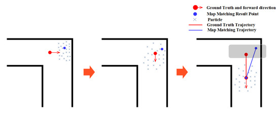 A corner refers to a place where the path has rotated a certain angle in the direction of pedestrians. In the PF algorithm, corners can quickly help eliminate the invalid particles that cross walls, and hence result in a better accuracy by keeping track of correct particles, as shown in Figure 8. In general, the more corners that exist in the environment, the better the accuracy of PF.