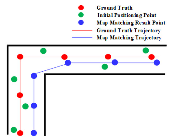 Map matching can be categorized into three main types: point-to-point matching, trajectory matching, and probabilistic graphical model [16]. The point-to-point method matches location points with the places of indoor spaces according to floor plans. Point-to-point matching is simple and computationally efficient, but it suffers from the way that the path network is digitized [17]. Trajectory matching uses the geometry and topology information of indoor structures (e.g., corners, narrow corridors, and rooms) to match the obtained trajectory [18,19]. Compared to point-to-point matching, trajectory matching is more robust and has smaller matching error, but it is more complex and has poor real-time capability. Probabilistic graphical model-based map matching calculates the location by associating each location with a probability and then updating the probability using spatial constraints [7,13,20]. Probabilistic graphical mode-based approaches can achieve higher accuracy than point-to-point matching and trajectory matching, but its computational burden is heavier.