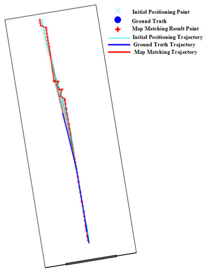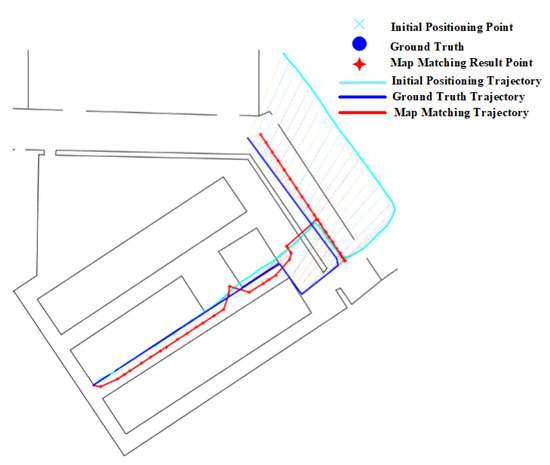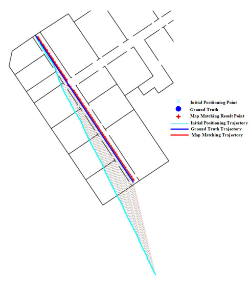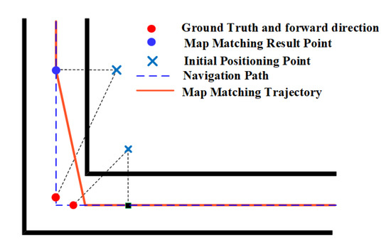 Corners also have a positive effect on the geometric algorithm. As shown in Figure 10, the matched positioning error is large before a corner, but the geometric algorithm significantly reduces the error by matching the positioning result to the projected point on the right edge. The heading constraints imposed by corners enable the geometric algorithm to use such information to correct positioning results.