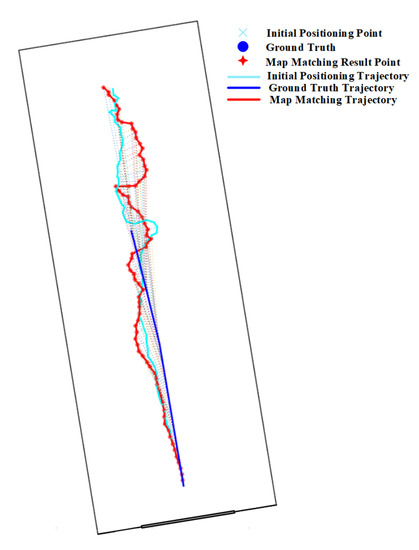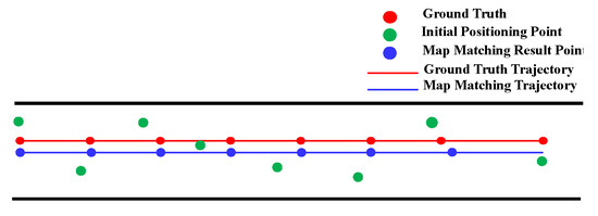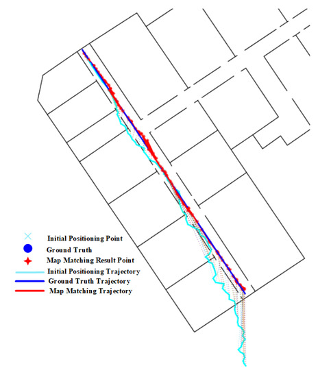 The geometric algorithm is a traditional map matching method, the basic idea of which is to map positioning results with the path network. It first determines the currently occupied path segment by certain rules, and then calculates the current location on the selected path segment [28,29]. These rules involve three weights, namely distance, orientation, and adjacent weight.