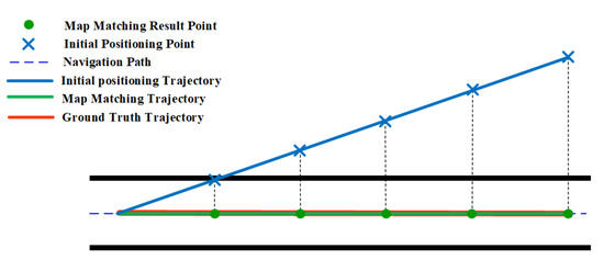 Thus, the path with the largest total weight is chosen as the occupied path, and the projection of the initial positioning point on the path is the final positioning result. Although the geometric algorithm is simple and computationally efficient, it often suffers from poor accuracy.