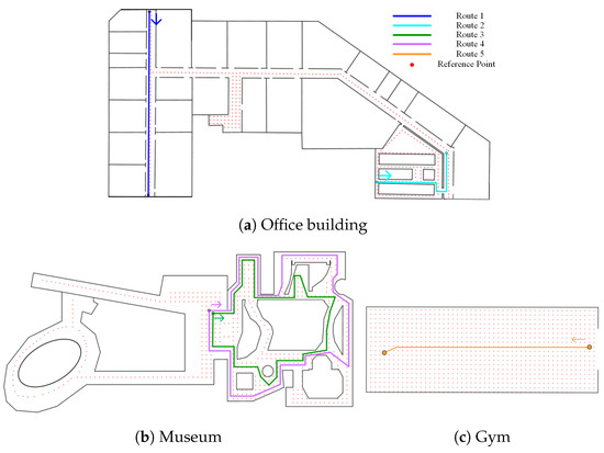 Five routes, which consist of different spatial characteristics, were designed to analyze the effect of these spatial characteristics on the selected map matching methods. The length of the five routes was 51, 33, 114, 138, and 27 m, respectively. As shown in Figure 14, we designed two routes (route 1 and 2) in the office building. Route 1 consists of a narrow corridor and was mainly used to analyze the effect narrow corridor on the map matching methods. Route 2 was used to analyze the effect of fork on the map matching methods. There were two routes (route 3 and 4) designed in the Museum. Routes 3 and 4 were mainly used to analyze the effect of corners and turns. Route 5 in the gym was utilized to analyze the influence of open spaces on the map matching algorithms.