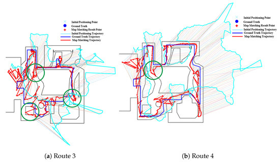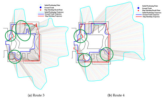 Positioning results of the geometric algorithm on Routes 3 and 4 (Green circle denotes the effect of forks).