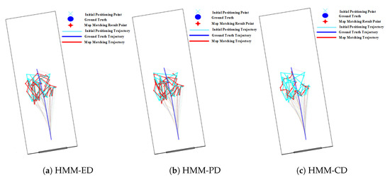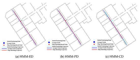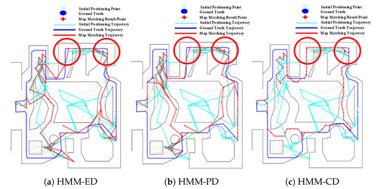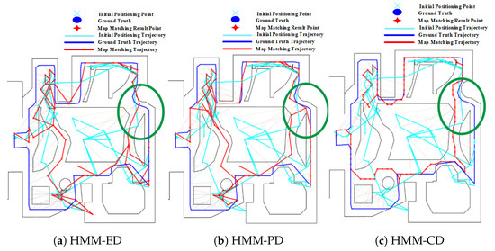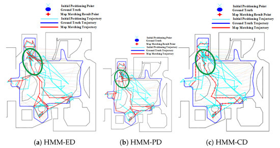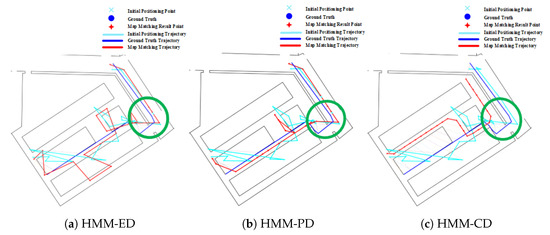 The effect of forks in route 2 on the HMM is shown in Figure 17. As we have described before, the HMM algorithm with lower transition probability is prone to generate cumulative error, which makes it re-match or mismatch to the adjacent and similar paths when encountered forks. We can see that the matched results from HMM-ED and HMM-PD in the fork area (denoted by the green circle) are on the right path (see Figure 17a,b), but the matched results from the HMM-CD (see Figure 17c) are on the wrong path due to the accumulated error.