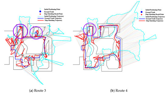 Positioning results of the PF algorithm on Routes 3 and 4 (Purple circle denotes the effect of Open Space).