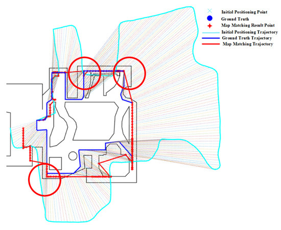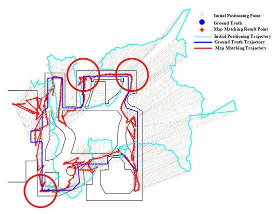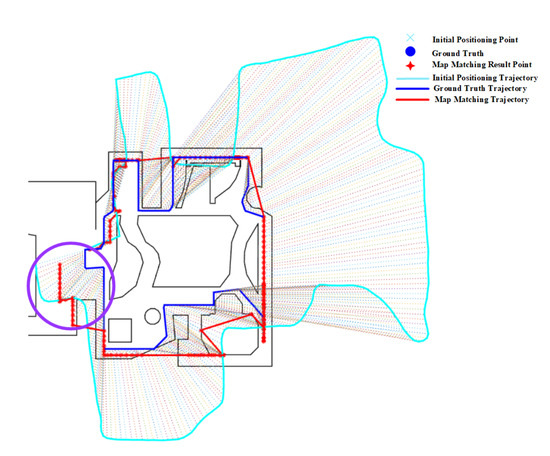 Open spaces have also no much impact on the geometric algorithm, as shown in Figure 25. The matched results of the geometric algorithm are usually on a navigation path close to the initial positioning results due to the accumulated error, and are easy to drift to incorrect areas. It is also obvious to see from Figure 26 that open space areas (denoted by purple circles) encounter a larger positioning error than narrow areas.