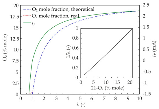 It should be noted that the real O2 mole fraction in the exhaust gas (red dashed line in Figure 2) differs from the theoretical one determined from Equation (1) (blue dashed line in Figure 2) due to an incomplete utilization of oxygen. In such case, a small amount of oxygen remains even under rich mixture. The difference is mainly manifested in the rich mixture range (λ < 1), where the emissions of unburned hydrocarbons (HC) and carbon monoxide (CO) influencing the molar balance in Equation (1) become excessive. In the range of lean mixtures, which is the case for diesel engines, the difference between real and theoretical oxygen concentrations is small. Additionally, the combustion efficiency in diesel engines is much higher than in spark ignition engines, thus resulting in lower CO and HC emissions.