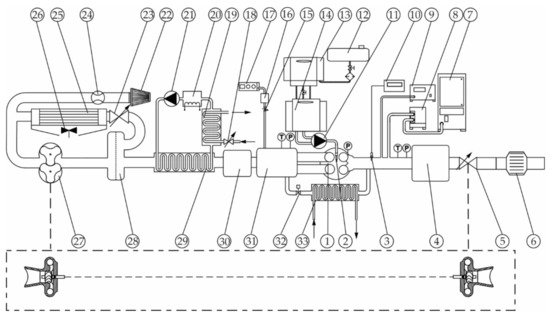 Schematic diagram of the engine test stand: (1) engine; (2) fuel injector; (3) UEGO sensor, (4) exhaust plenum; (5) exhaust backpressure valve; (6) exhaust muffler; (7) Fourier Transform Infrared (FTIR) analyzer; (8) heated filter; (9) soot meter; (10) LA4 lambda meter; (11) high pressure fuel pump; (12) fuel tank; (13) fuel consumption meter; (14) fuel conditioner; (15) intake air control valve; (16) intake air plenum chamber; (17) intake gas analyzer; (18) intake cooling valve; (19) heat exchanger; (20) air coolant electric heater; (21) air coolant pump; (22) air filter; (23) bypass valve; (24) air-flow meter; (25) bypass air cooler; (26) air cooler fan; (27) roots compressor; (28) oil separator; (29) intake air heat exchanger; (30) intake plenum; (31) intake plenum/exhaust gas recirculation(EGR) mixing chamber; (32) EGR control valve; (33) EGR cooler.
