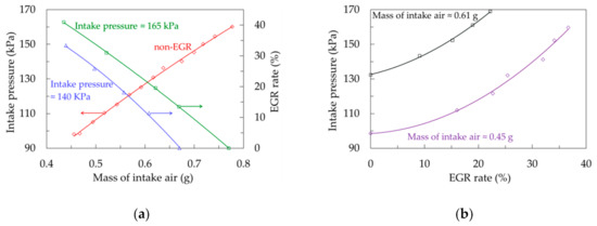 Explored intake gas conditions relevant to UEGO signal quality: (a) EGR sweeps at constant pressure and pressure sweep at non-EGR; (b) intake pressure and EGR relations at constant amounts of in-cylinder air.