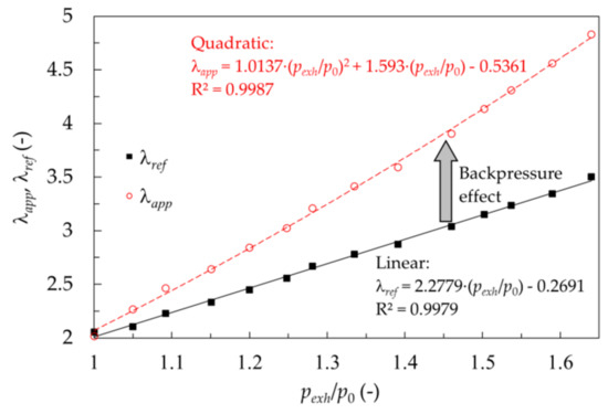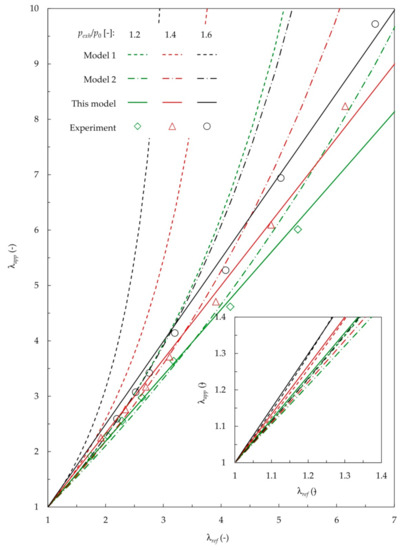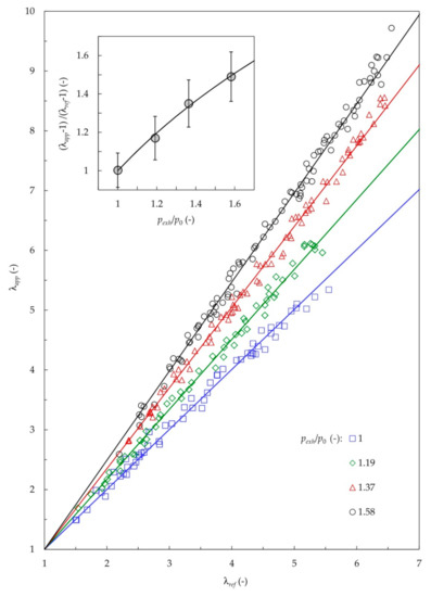 The pressure ratio is of prime significance. Since λapp changes linearly with λref for individual pressure ratios, the directional coefficient of this line changes with the pressure ratio itself. This dependence is plotted in the upper left corner of Figure 6. One can note that the relation here is logarithmic and can be explicitly formulated as shown in Equation (7):