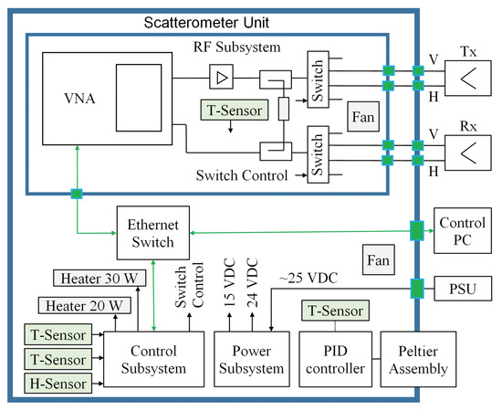The thermo-mechanical design of SodSAR’s Scatterometer Unit follows a “box-in-a-box” principle for advanced thermal control. The outer box (the casing of the Scatterometer Unit) is made of a commercial, water-tight polypropylene transport container. The outer box provides mechanical protection and thermal insulation as well as protection against precipitation and other weather conditions. The outer box is mounted on a pedestal and the overall dimensions of the Scatterometer Unit are approx. 82 × 60 × 61 cm (L × W × H). The inner box (made of aluminium) incorporates the RF Unit that consists of the VNA and all RF components except antennas and external RF cable harness. The other main subsystems incorporated in the Scatterometer Unit are the Control Subsystem, Power Subsystem, Temperature Control Subsystem, and Ethernet Switch. A block diagram of SodSAR scatterometer system is presented in Figure 2 and an illustration of the 3D structure in Figure 3.