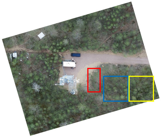 The SodSAR system has been mounted on a tower overlooking a sparse scots pine (pinus sylvestris) forest, at an elevation of approximately 19 m, allowing observations from above the forest canopy (canopy crown height at the site is at approximately 12–15 m). SodSAR is mounted on a 5 m rail enabling movement in the lateral direction for SAR imaging, and equipped with a three-axis pointing device, allowing directing the beam in azimuth and elevation. Positioning along the rail (azimuth) has a precision of millimeters and the pointing device offers sub-degree precision. Movement along the rail is achieved by a rack driven carriage. Figure 4 depicts the area and the tower. The image was taken during the summer of 2019 by a drone. We have chosen three sections from the SodSAR scene analysis, each of them presenting a different composition: Section 1 (red box) covers a patch of open ground, Section 2 (blue box) covers an area with light vegetation and Section 3 (yellow box) covers an area with a lower incidence angle thus the signal is affected more by the surrounding canopy. Section 1 is 9 m long and 6 m width while Sections 2 and 3 are 10 × 10 m. The biomass of each section was estimated based on [18], the required forestry measurements were done during the summer of 2019. Section 1 presents a biomass concentration of , Section 2 presents and Section 3 presents .