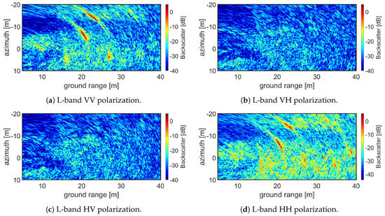 An example of a reconstructed SAR image is presented in Figure 7. The image acquisition time was 23 September 2019-06:51:28 UTC. The SAR image has been formed out of measurements along the track (every 10 cm), each of them consisting of frequency samples between 1 and 2 GHz with the VNA output power set at −10 dBm, for the full polarimetric case. The maximum range is 75 m. The image covers from 5 to 40 m in ground range and from −20 to 10 m in azimuth. Best range resolution correspond to a point located in the far-end of the image, with value m. Azimuth resolution has been calculated for a point located in the middle of the aperture in near-end of the image, for this point m. Range and azimuth pixel resolution is 0.1 m. In scene two dihedral Corner Reflectors (CR) are present. One located 20 m in ground range and 7 m in negative azimuth and the other located 23 m in ground range and 14 m in negative azimuth. Ideally, dihedral CR only produce a co-polar response and therefore are only seen in VV and HH images, corresponding to Figure 7a,d, respectively.