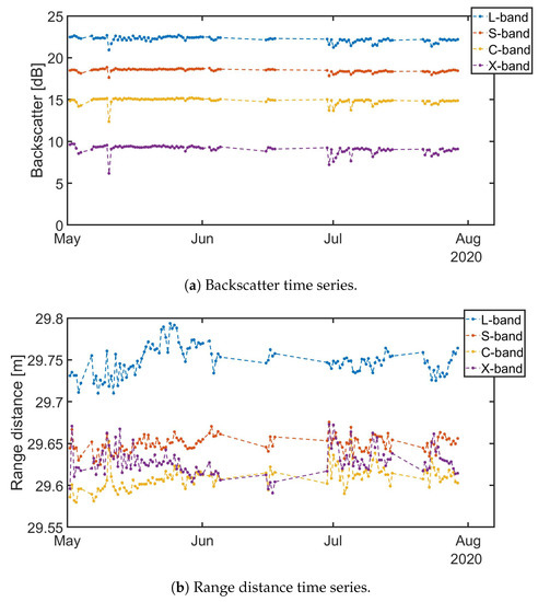 Backscatter and Range distance time series from 1 May 2020 to 29 July 2020, for a total of 117 acquisitions, VV polarization and L-, S-, C- and X-band.