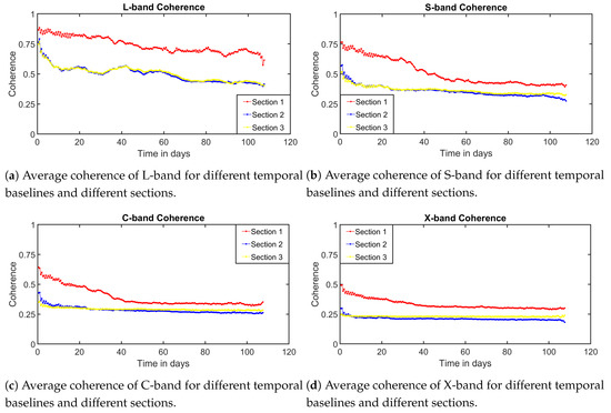 Average observed temporal coherence for four different bands, each of them for three different sections with different characteristics.