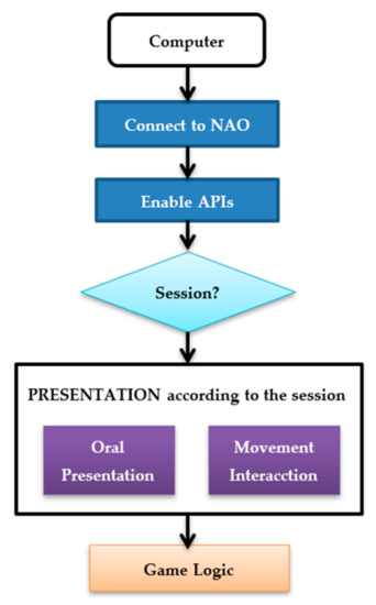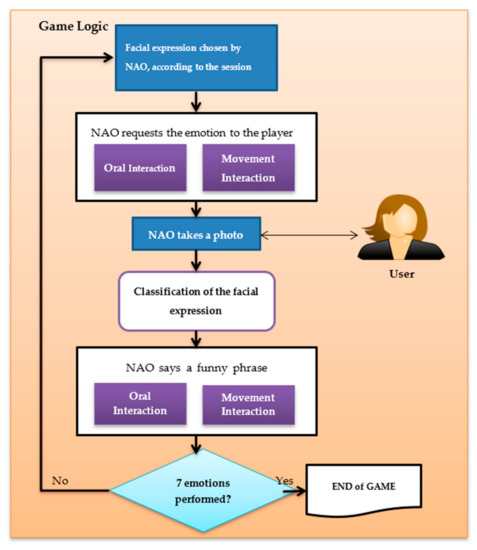 In this subsection the structure of the game is explained (see Figure 1). First, a connection is established between the computer and the NAO robot. Second, the APIs responsible of speech and movement are enabled to allow it to initiate the interaction with the user. Third, the robot verifies the session in which is the game and varies its oral presentation according to the session, while making smooth movements with its arms in order to create a simulation of reality. In this presentation, the robot explains how the experiment will be performed by the user and the game logic begins (see Figure 2). This logic consists of selecting a facial expression from among seven facial expressions (anger, disgust, fear, happy, neutral, sad and surprise) according to the session initiated. Then, the robot begins to interact with the user, challenging the participant to show the proposed expression. The user performs the facial expression proposed by the robot and the robot takes a photo of the user. If the detection of the face is favourable, the image will be pre-processed and classified with the neural network. With this process, the robot is able to recognize the expression made by the user. For each recognized expression, the robot interacts with the user, trying to motivate and involve the user in the game through funny phrases. In case of not recognizing a face, the robot apologizes to the user and requests a replay of the facial expression. All this process is repeated until the seven facial expressions are performed, in order to finish the game correctly.