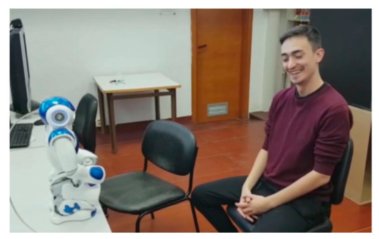 A total of 29 people participated in the experiment. Each participant was evaluated individually and signed the informed consent at the beginning of the experiment, since our robot would capture his or her images. The participant sat in front of the robot (see Figure 3) and followed the instructions of NAO, without any help from the interlocutor. The robot began with an explanatory presentation of the game and involved the user by addressing him or her by name, to give a sense of personalized application. In this presentation, the robot acts as if it were an evaluator of actors and actresses, challenging the participant to perform each one of the six basic expressions (happy, sadness, disgust, anger, surprise and fear) [57] in addition to the neutral expression. Each expression was evaluated with the CNN proposed in [38]. Then, the robot maintained a certain dialogue with the user depending on the recognized expression. These dialogs are usually funny phrases in relation to the expression made, and therefore, users usually smile and have a better user experience (see Figure 4).