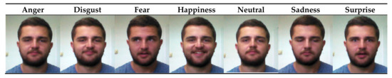 Finally, the image is processed by the CNN (developed by the authors in [38]), to obtain the recognized expression. Since none of the participants of this experiment were included in any of the datasets (BU4FDE [53], CK+ (extended Cohn-Kanade) [54], Japanese Female Facial Expression (JAFFE) [55], Warsaw Set of Emotional Facial Expression Pictures (WSEFEP) [56] and Facial Expression, Gender and Age (FEGA) [38]) were the different datasets used to train the neural network used for training, and the results of this experiment can be considered as a test set that evaluates this CNN in a real environment.