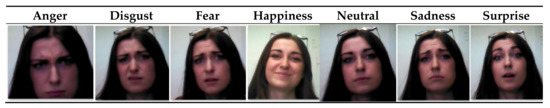 - Lucey, P.; Cohn, J.F.; Kanade, T.; Saragih, J.; Ambadar, Z.; Matthews, I. The extended cohn-kanade dataset (ck+): A complete dataset for action unit and emotion-specified expression. In Proceedings of the 2010 IEEE Computer Society Conference on Computer Vision and Pattern Recognition-Workshops, San Francisco, CA, USA, 13–18 June 2010; pp. 94–101. [Google Scholar]