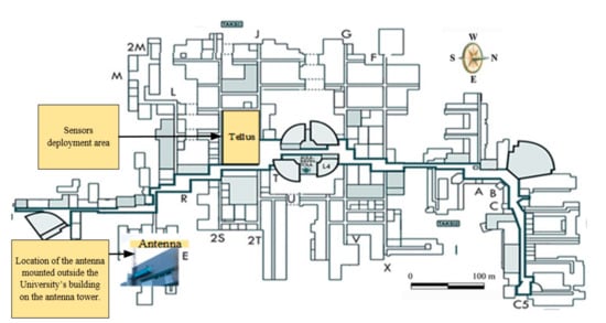 In order to deploy the system, we followed the following methodology. First, we identified the positions of the sensor nodes mindful of the targeted area layout and the characteristics of the sensors (e.g., the sensing range). The total number of the sensor nodes was one of the outcomes of this planning phase. Next, we conducted a predeployment analysis to confirm the feasibility of the target deployment. In the predeployment analysis, we did an initial experiment which ensured that our target area could be covered by a single gateway located at the selected location [27]. Third, to cover the whole target area with a single gateway, we selected a place for the gateway and its antenna, as shown in Figure 2. Fourth, to select the DR/SF(s), we estimated the signal quality from several locations of the target deployment area. Once the test activities were completed, the sensor nodes were configured and deployed. Finally, the network was tested again in order to ensure that the entire setup worked properly.