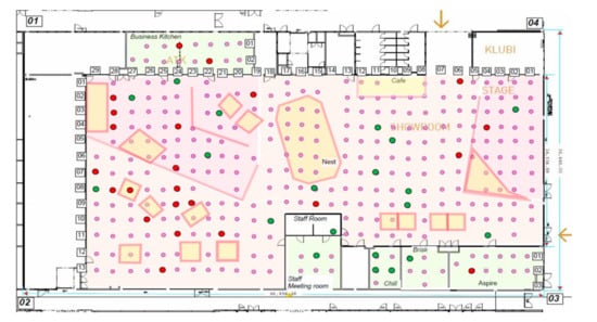 The floor plan showing the sensor node deployment in Tellus area inside the University of Oulu. The deployed sensors are shown as dots, distances are shown in meters, green dots indicate the sensors with the lowest packet error rate (PER) and the red dots are the ones with highest PER. Further details are provided in Section 4.