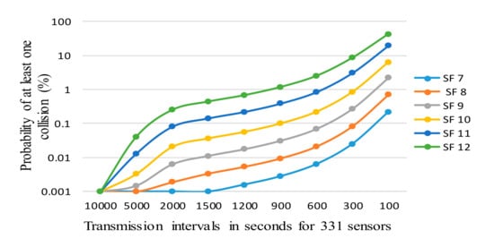 Effect of the spreading factor (SF) and report period on the probability of collisions for 331 sensor nodes (24-byte payload, C = 3 channels, one packet per interval T, calculated using Equation (2)).