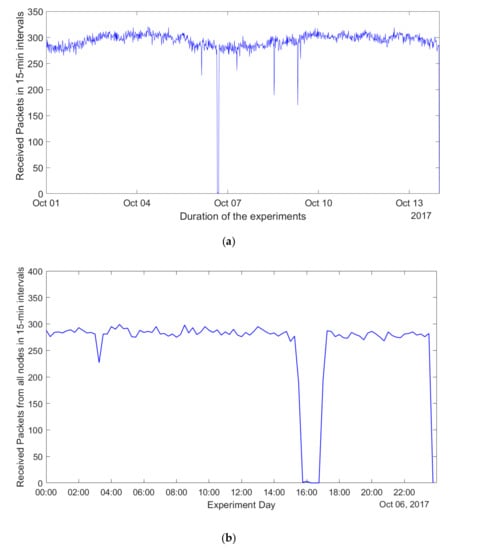 When analyzing the results, it is important to note that all 331 sensors were configured to send their packet with a period of 15 min, and we did not follow any specific pattern when starting the sensors. Therefore, if no packets are lost, 331 packets should be received within each 15-min interval. To validate this, we divided the time into 15 min intervals and calculated the number of packets received by the gateway in each of them. The illustrative results for the period from 1 October to 14 October 2017 are plotted in Figure 5a. One can see that most of the time the number of the packets received by the gateways was between 250 and 300. However, there were also several intervals when much fewer and even no packets were received. For example, during 6 October there were few consecutive intervals (i.e., 15:00 to 16:30) when no packets were received (for convenience, the total number of packets received in a 15-min interval for 6 October 2017 is illustrated in Figure 5b).