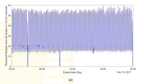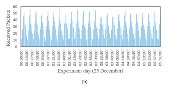 Packet reception by the IoT server on different days. (a) Number of packets received in a 1.5-min interval from all the nodes for a day (15 December 2017). (b) Number of packets received in a 1.5-min interval from all the nodes for six hours (25 December 2017).