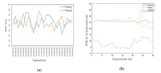 Packet error rate (PER) on the IoT server. (a) PER on different days for weekend and weekday. (b) PER on different days for three different months in three seasons.