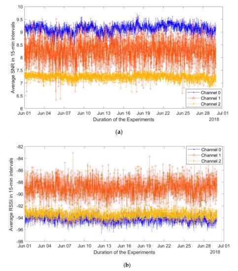 We also analyzed the relevant radio channel performance metrics measured by the gateway, namely the radio signal strength indicator (RSSI) and the signal-to-noise ratio (SNR). The respective average values plotted for each frequency channel are illustrated in Figure 9a,b. From these charts, one can see that for packets in channel one, where a great number of packets were lost, the RSSI takes the highest values and SNR is the second best. This result may seem counterintuitive at first. However, it can be explained since both RSSI and SNR are measured by the gateway and recorded only for the packets, which were received correctly. The packets that were not correctly received, e.g., due to the interference, likely had low SNR and RSSI, thus not affecting the statistics. Note that the fluctuations (especially the short-term ones) for both RSSI and SNR for packets sent over channel one are higher than that for the two other channels, where packet losses were much lower. This observation may be useful for enabling detection of a potentially poorly performing channel; however, further investigation on this is required.