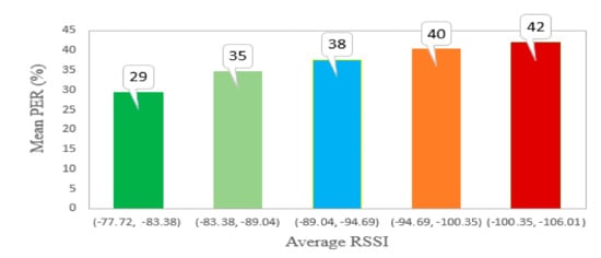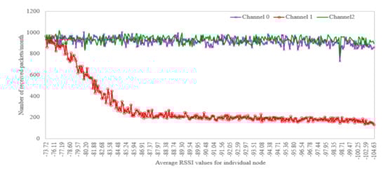 We continue the analysis of the channel effect on the communication performance by investigating how RSSI affects PER. For this, we divided the whole observed range of average sensors’ RSSI values into five bins and estimated the average PER for all the sensors in each bin. The results are depicted in Figure 10. Not surprisingly, with the increase of the average RSSI, the PER increased. However, it can be seen that this increase was not very sharp. To detail this further, we also estimated the effect of the RSSI on the number of packets received in the different frequency channels. For this, we sorted all the sensor nodes based on the average RSSI of their signals and then plotted the number of the packets received from these sensors over each frequency channel. These results are depicted in Figure 11. It can be seen that for the sensors with a high RSSI (i.e., 73–77 dBm), the number of packets received over each of the three channels is about the same. However, with the increase of the channel attenuation between an end device and the gateway, a number of packets received in channel one drops greatly. When the RSSI falls below −85 dBm, the number of packets received over channel one saturates at about 20–25% of that received in the other channels.