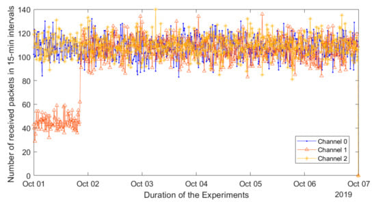 The LoRaWAN MAC implies the use of multiple frequency channels, with three (the so-called default channels) being an absolute minimum. The channel to be used for an uplink transmission is selected by an end device randomly, keeping in mind the duty cycle restrictions. Therefore, in our further analysis, we focused on investigating whether the frequency band used affects the performance of the network. The respective results, revealing the number of packets received over each of the three channels and the per-channel PER, are depicted in Figure 8a,b. Our results reveal that the number of packets received through channel one was much (about three times) lower than that from channels two and three. Implying the uniform use of each channel (which is logical, since the duty cycle limitation for each of them is the same), in average about 110 packets should be sent per a 15-min interval in each channel. However, in channel one, only 35 packets are received by the gateway on average. Two reasons may explain this behavior, namely (i) nonuniform use of the frequency channels by the transmitters, and (ii) higher loss of packets transmitted in channel one. To get a more in-depth insight into the reason after this, we selected several nodes, which demonstrated the lowest PER throughout (2–3%) the whole duration of our measurements (sensor nodes are marked with green color in Figure 3) and investigated the distribution between the frequency channels of the packets received from these nodes. These results demonstrated a uniform distribution of the packets between the different frequency channels. Therefore, we conclude that the key reason for the observed behavior was the higher packet loss in channel one (i.e., 868.3 MHz) compared to the other frequency channels.