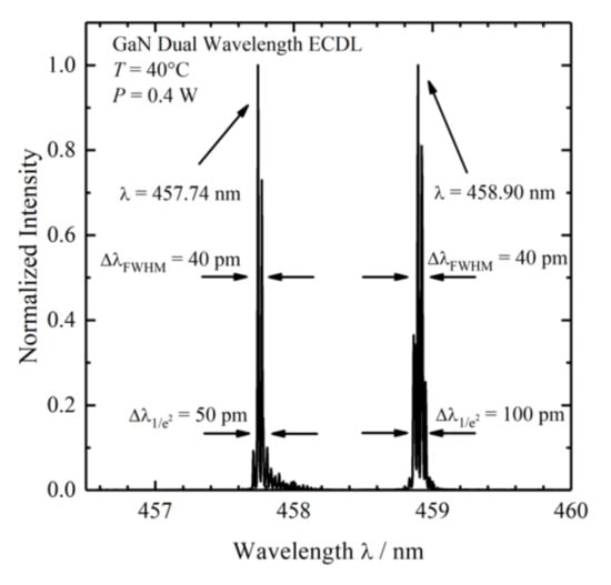Figure 1. Emission spectra of the dual-wavelength GaN external cavity diode laser (ECDL) measured at an operating temperature of 40°C and an optical output power of 0.4 W.