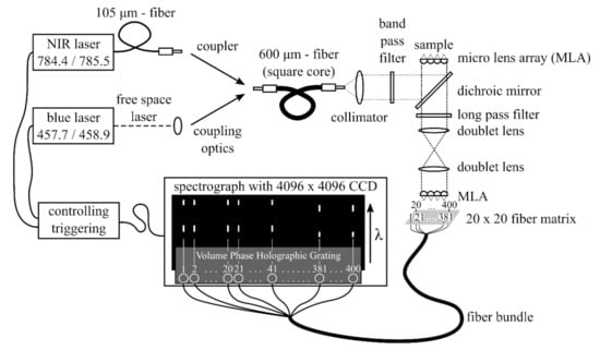 - Schmälzlin, E.; Moralejo, B.; Rutowska, M.; Monreal-Ibero, A.; Sandin, C.; Tarcea, N.; Popp, J.; Roth, M.M. Raman imaging with a fiber-coupled multichannel spectrograph. Sensors 2014, 14, 21968–21980. [Google Scholar] [CrossRef] [PubMed]