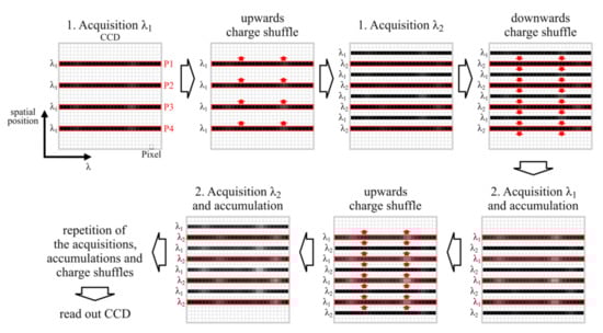 At first, a wide field Raman image of the sample is measured with the first excitation wavelength (λ1). Each signal trace corresponds to a full spectrum at a distinct spatial position. Then, all charges are shifted up by 5 pixels on the CCD, the excitation wavelength is changed to λ2, and a new wide field Raman image of the sample is taken. A CCD consists of a light-sensitive area organized in vertical columns of electrodes. Four electrodes in series form a pixel in our case. They are separated horizontally by potential wells. Applying high or low voltage to the electrodes in a special scheme allows collecting electrons (charge) underneath. Clocking the electrodes with a dedicated voltage pattern moves the charge from electrode to electrode. All electrodes are equivalent and therefore charge transfer vertically up and down is possible. A shift of 5 pixels transfers the signal traces into the centers of the spaces in between their recording positions. A transfer to the centers minimizes the risk of crosstalk to the respective new recorded upper and lower signal traces. Then, all charges are shifted down by 5 pixels on the CCD, and the excitation wavelength is shifted back to λ1. This ends the first acquisition cycle. By repeating these steps, several acquisitions with two different wavelengths can be accumulated without reading out the CCD chip in between measurements. The challenge of this technique is the high instrumental complexity and, in case of very intense signals, the danger of crosstalk due to the lower pixel distance between the signal traces. However, there are several advantages to this method:
