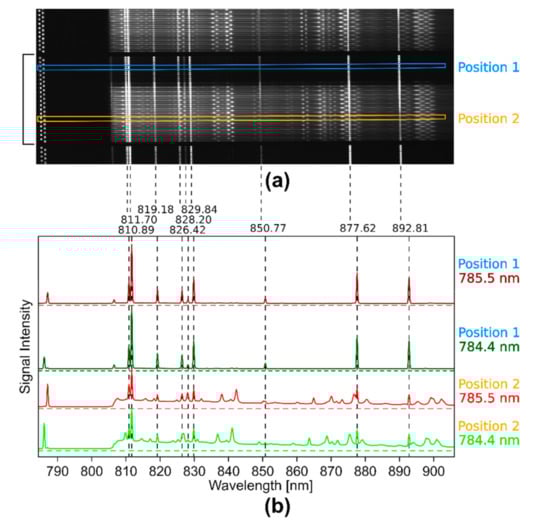 The two Raman images are shifted on the CCD by 5 pixels in the vertical direction. Therefore, every second trace belongs to the same excitation wavelength and hence the Raman image and each neighboring wavelength pair belong to the same spatial position on the probe head. The oscillating dots on the left side of every trace correspond to the residual intensity of the excitation laser light that reached the detector in spite of the long-pass filter. The spots on the right of the laser signals correspond to Raman bands that shift with the excitation wavelength and to very intense, non-shifting signals of the fluorescent lamp. Figure 4b shows the profile plots of the four signal traces (λ1 in green and dark green; λ2 in red and dark red) inside the blue (Position 1) and orange (Position 2) boxes in Figure 4a. At the position of the blue box, there are fluorescent lamp bands only, whereas at the position of the orange box, the Raman signals are superposed with these bands that are shown by black vertical, dotted lines. Their positions were indicated on top in nm and coincide well with the emission bands of Krypton []. After comparison of the profiles, the Raman bands can be discriminated from the fluorescent lamp bands. Some Raman bands overlap with the fluorescent lamp bands after the shift of excitation wavelength (red spectrum), which would make it hard to correct for the fluorescent lamp contributions with computational methods. According to the position of the Raman bands and their profile, the selected Raman spectra belong to paracetamol. The image of the CCD chip also shows how close together all the signal traces are. If the signal intensities on the exposed pixels on the CCD are too high, the intensities cause crosstalk in the surrounding pixels and even in the neighboring shifted spectra. This is a limitation of the nod and shuffle approach, requiring careful monitoring of the overall intensity distribution between the spectra and the use of appropriately weighted extraction schemes such as optimal extraction [].