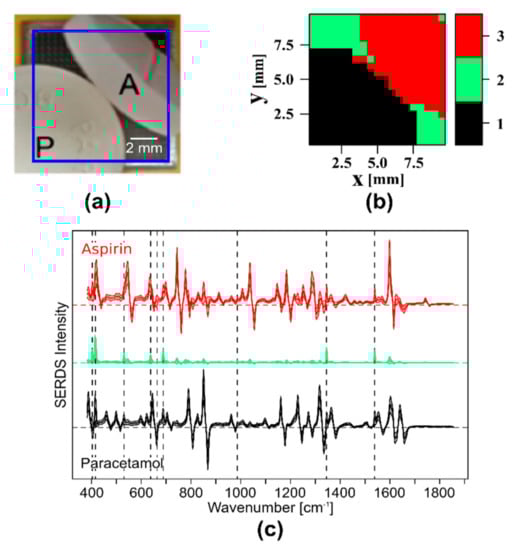 SERDS imaging using nod and shuffle of a paracetamol (P) and an aspirin (A) pill with an acquisition of 200 times 200 ms. (a) Picture of the sample on the probe head, the blue square corresponds to the field of view; (b) cluster map of the SERDS image; (c) clustered mean SERDS spectra and their standard deviation, cluster 1 = paracetamol (black), cluster 2 = no sample/residual room light (green), cluster 3 = aspirin (red); the dotted, vertical black lines indicate the position of the room light bands.