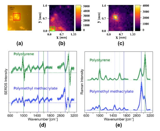 SERDS imaging of polystyrene and polymethyl methacrylate beads: (a) bright field image of the sample, red box shows a region of larger PMMA beads; (b) PS intensity map based on the intensity of three marker bands in the baseline corrected, reconstructed Raman spectra; (c) PMMA intensity map based on the intensity of three marker bands in the baseline corrected, reconstructed Raman spectra; (d) mean SERDS spectra and their standard deviation for nine spectra with the highest intensities for PMMA and PS marked by boxes (green for PS, blue for PMMA) in the corresponding intensity maps; (e) baseline corrected and reconstructed mean Raman spectra with standard deviation of the SERDS spectra shown in (d); The vertical lines in (d,e) indicate the marker bands (green for PS; blue for PMMA) that were used to create the intensity maps (b,c).
