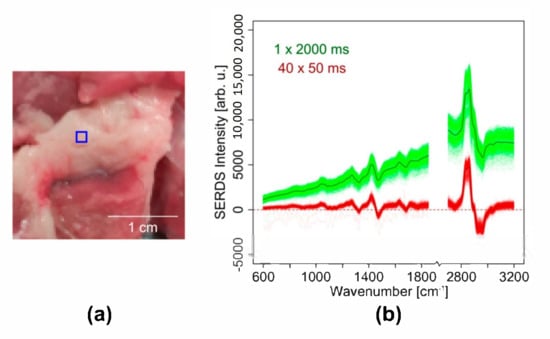 The two resulting Raman images of each measurement were subtracted. The SERDS spectra for the two SERDS images, with the mean difference spectra marked as dark colored lines (see Figure 7b), show the typical difference profile of lipid-rich tissue with bands at 1446 cm−1, 1650 cm−1, and 1740 cm−1. While the SERDS bands have comparable absolute intensities, it is clearly visible that the difference spectra show a stronger residual background for the longer acquisition time (green spectra) due to the aforementioned photobleaching effect: At the beginning of the measurement at λ1, the pork shows remarkable autofluorescence that significantly decreases during the 2 s measurement time. At the beginning of the measurement at λ2, the autofluorescence is already decreased.