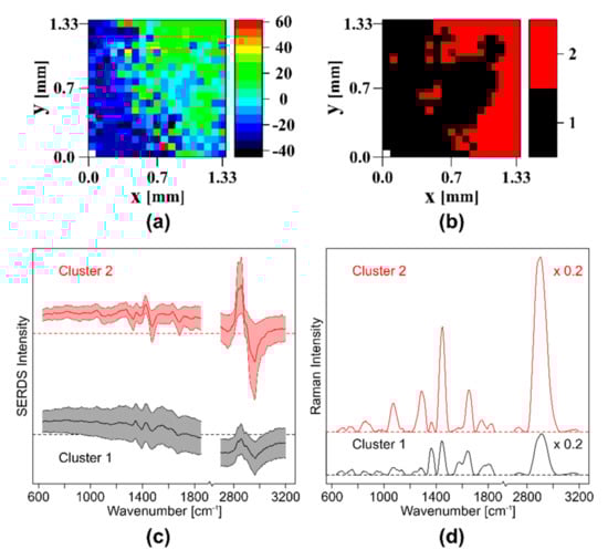 SERDS imaging of a piece of pork meat with protein and lipid-rich areas: (a) intensity map of the SERDS spectra at 2900 cm−1; (b) cluster map of the SERDS spectra; (c) clustered normalized, mean SERDS spectra and their standard deviation; (d) reconstructed and baseline corrected mean Raman spectra of the two clusters shown in (c). The high wavenumber regions were multiplied by 0.2 for better visualization.