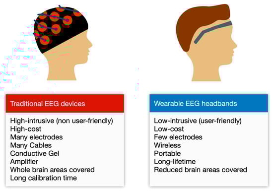 Most of the work performed with EEG signals use intrusive brain computer interfaces (BCI) devices, normally inside hospitals [9]. These traditional BCIs have up to 256 channels (electrodes) and are uncomfortable to wear in outdoor activities, because they need to be in direct contact to the head scalp (it needs even a conductive gel) at different locations, involving expensive machinery and cables paired to the head of the user [10]. The low-cost and low-intrusive EEG headbands, with only a few electrodes, are more comfortable (without cap, cables, and conductive gels) and portable than intrusive EEG devices. Figure 1 summarizes the differences between traditional EEG devices and EEG headbands. EEG headbands could replace traditional EEG machinery for some tasks, especially in combination with ML techniques, which could learn different states of the mind. These headbands prioritize the usability (user-friendly), and the adoption of the headbands by the general public, due to its low-price, versus the accuracy and precision of the data.